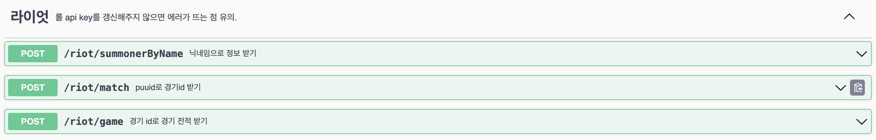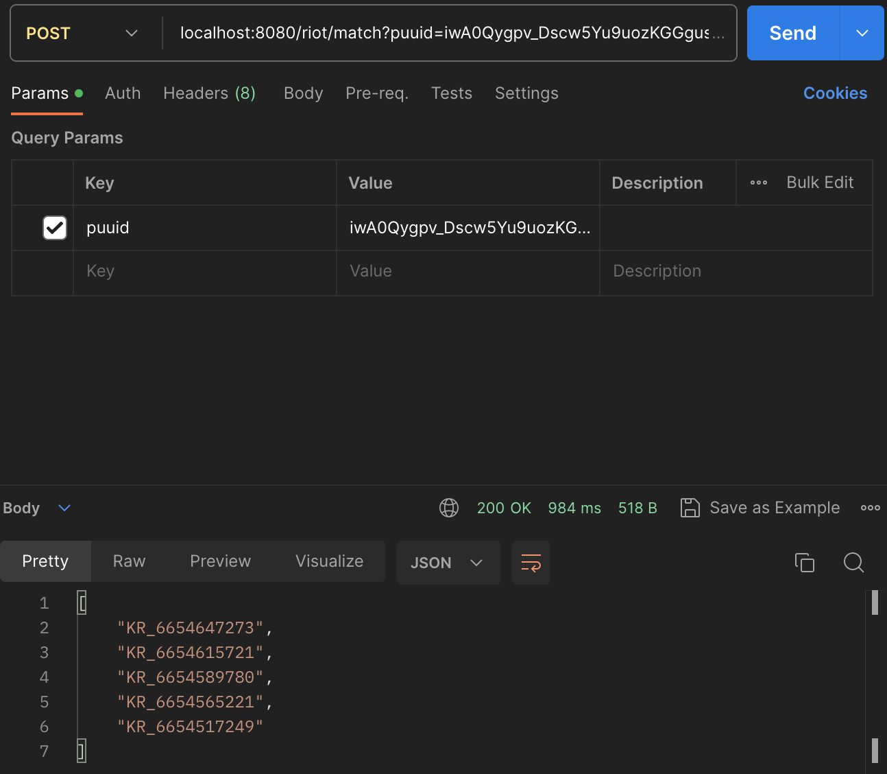 위에서 얻은 puuid를 입력하면 최근 경기 5판의 id를 얻을 수 있다.