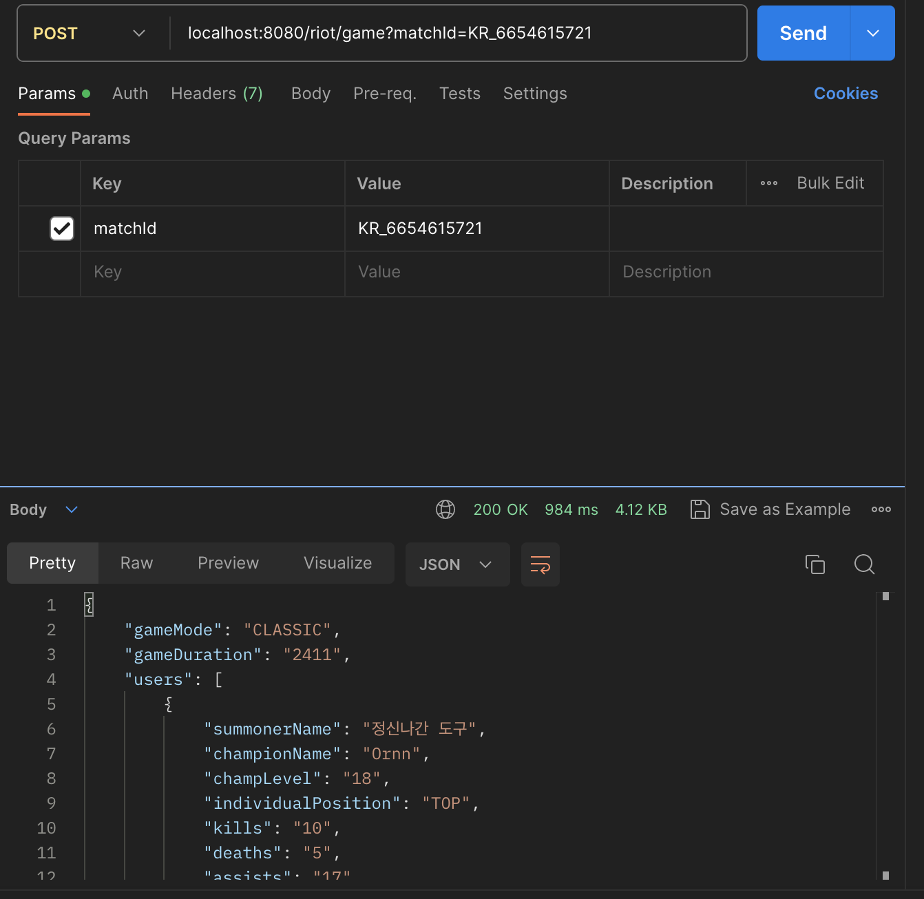 우선은 경기의 id를 배열형태로 출력만 하는데, 만약 그 경기들의 정보도 같이 리턴하고싶으면 다음에 for문 안에 matchDetailInfo를 넣어준다.