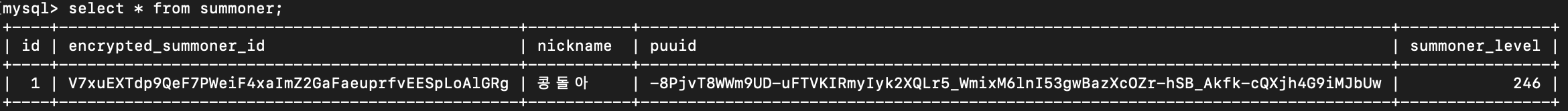 라이엇에서 제공하는 api를 SummonerDTO형식으로 받아오고, SummonerDTO의 toEntity를 사용해 Summoner db에 저장할 때는 내가 원하는 컬럼만 저장한다.