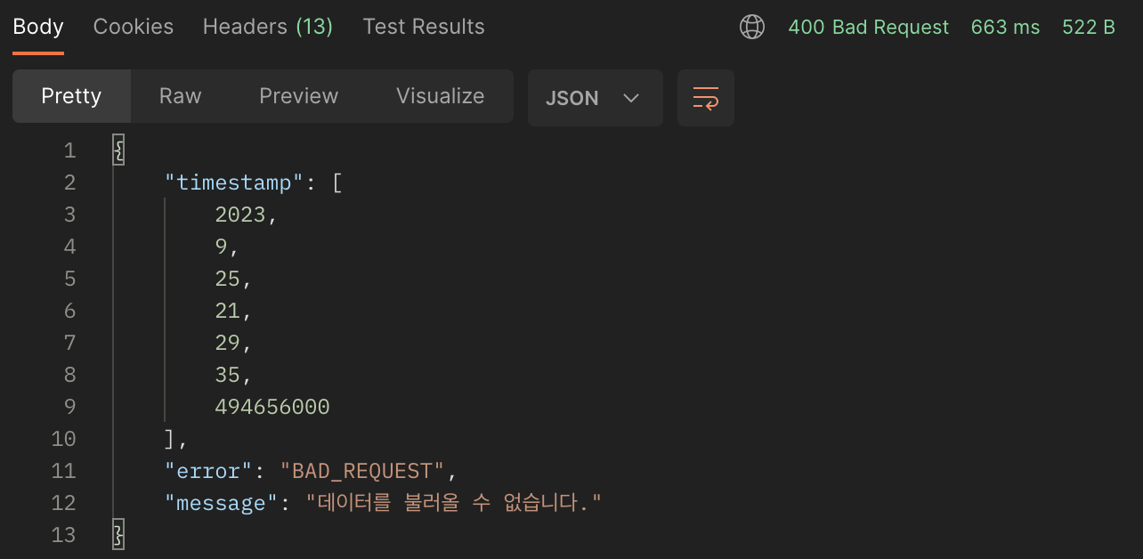 ErrorResponse에서 선언한 변수인 timestamp, error, message가 반환됨