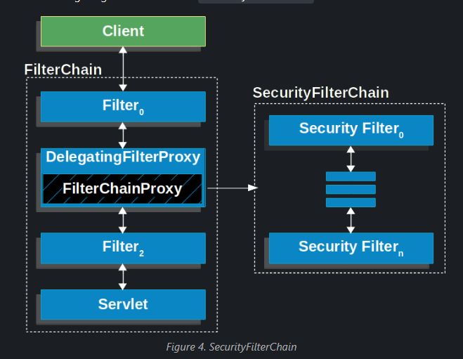 DelegatingFilterProxy의 내부에 FilterChainProxy라는 위임대상을 가지고 있다. FilterChainProxy는 SpringSecurity에서 제공되는 특수 필터로 SpringSecurityFilterChain이라는 이름을 가진 Bean을 호출하여 SecurityFilter의 역할을 수행한다.