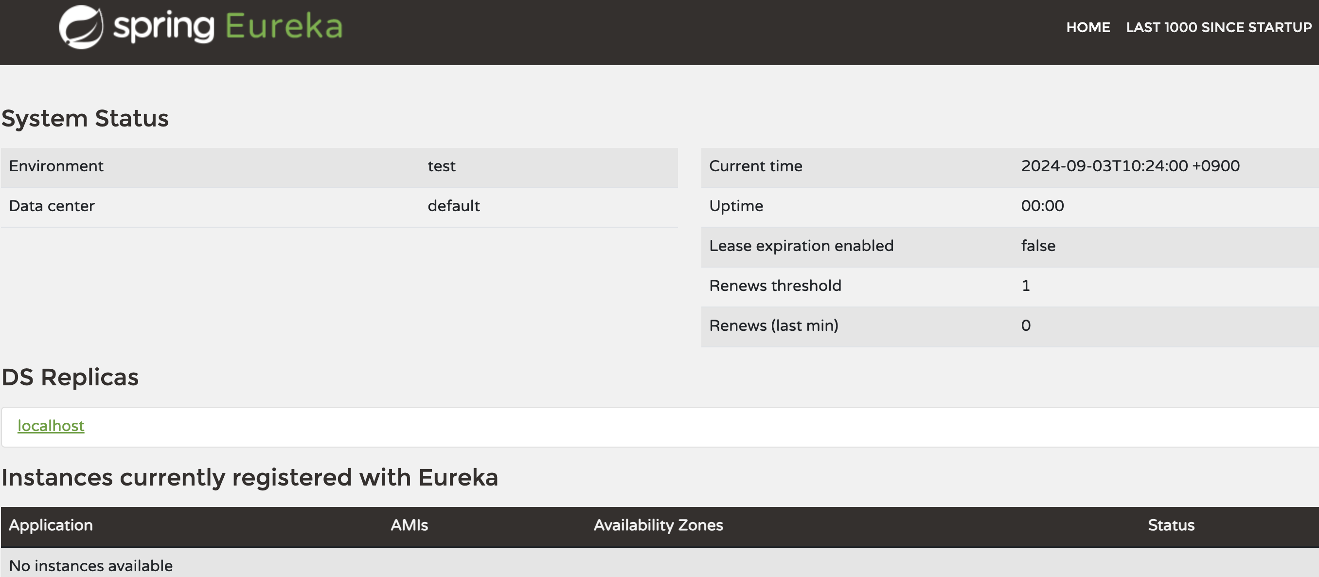 - fetch-registry: false → 다른 유레카 서버로부터 인스턴스들의 정보를 주기적으로 가져올 것인지 설정, 단일 유레카 서버 자체로 기동하여 등록할 필요없음