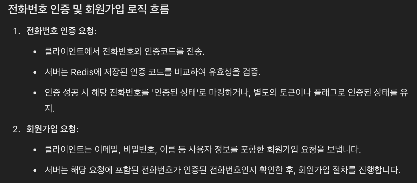 - 회원가입 시 redis에 verified_phone:{phone} 있는지 확인하는 로직 추가