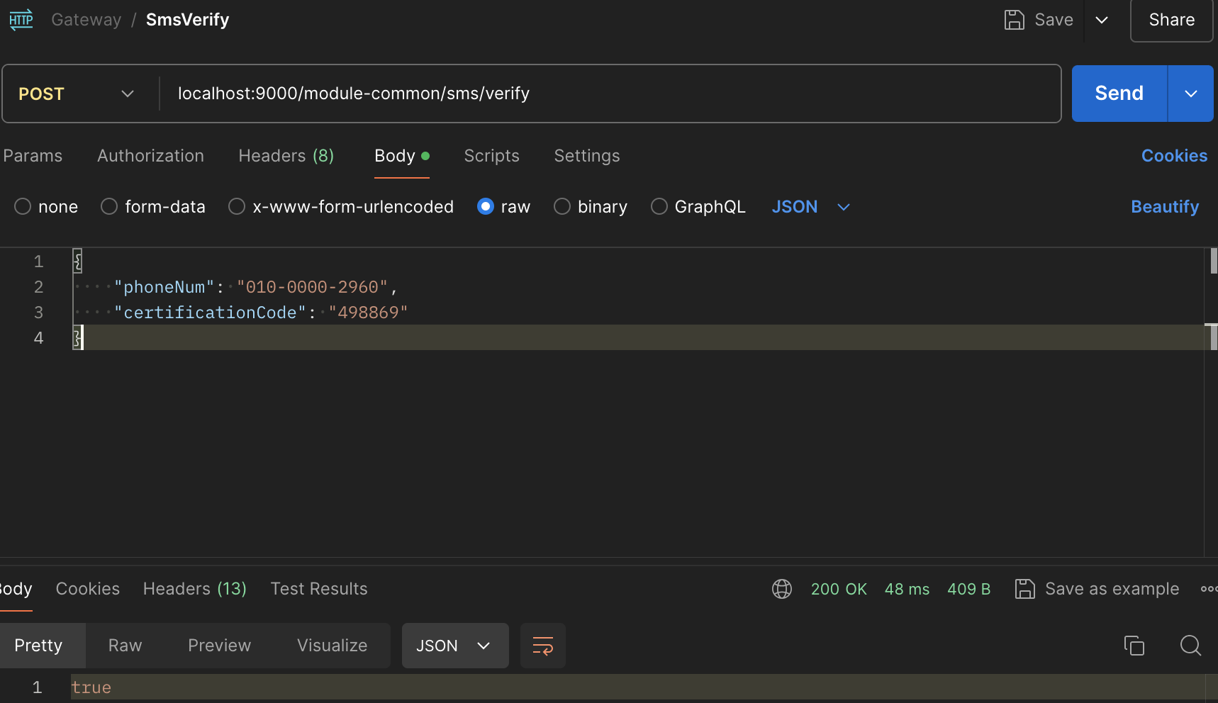 public boolean verifySms(SmsVerifyRequest smsVerifyRequest){