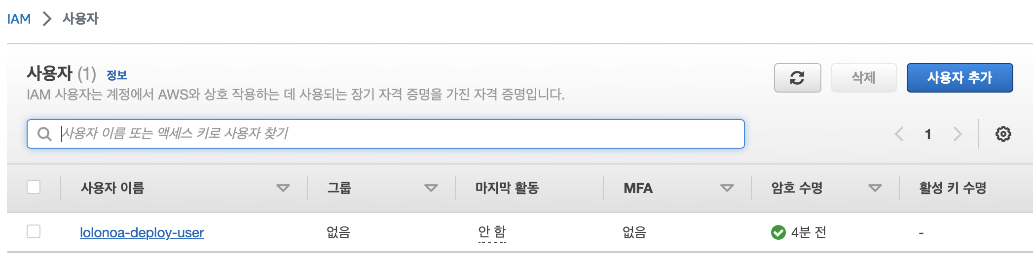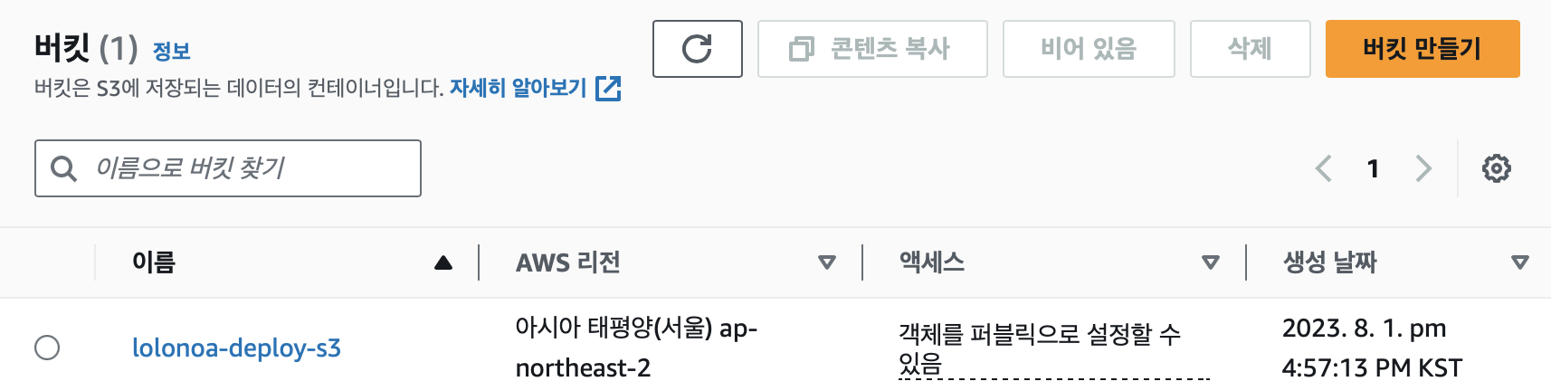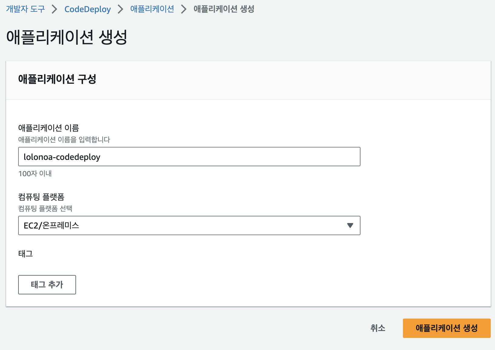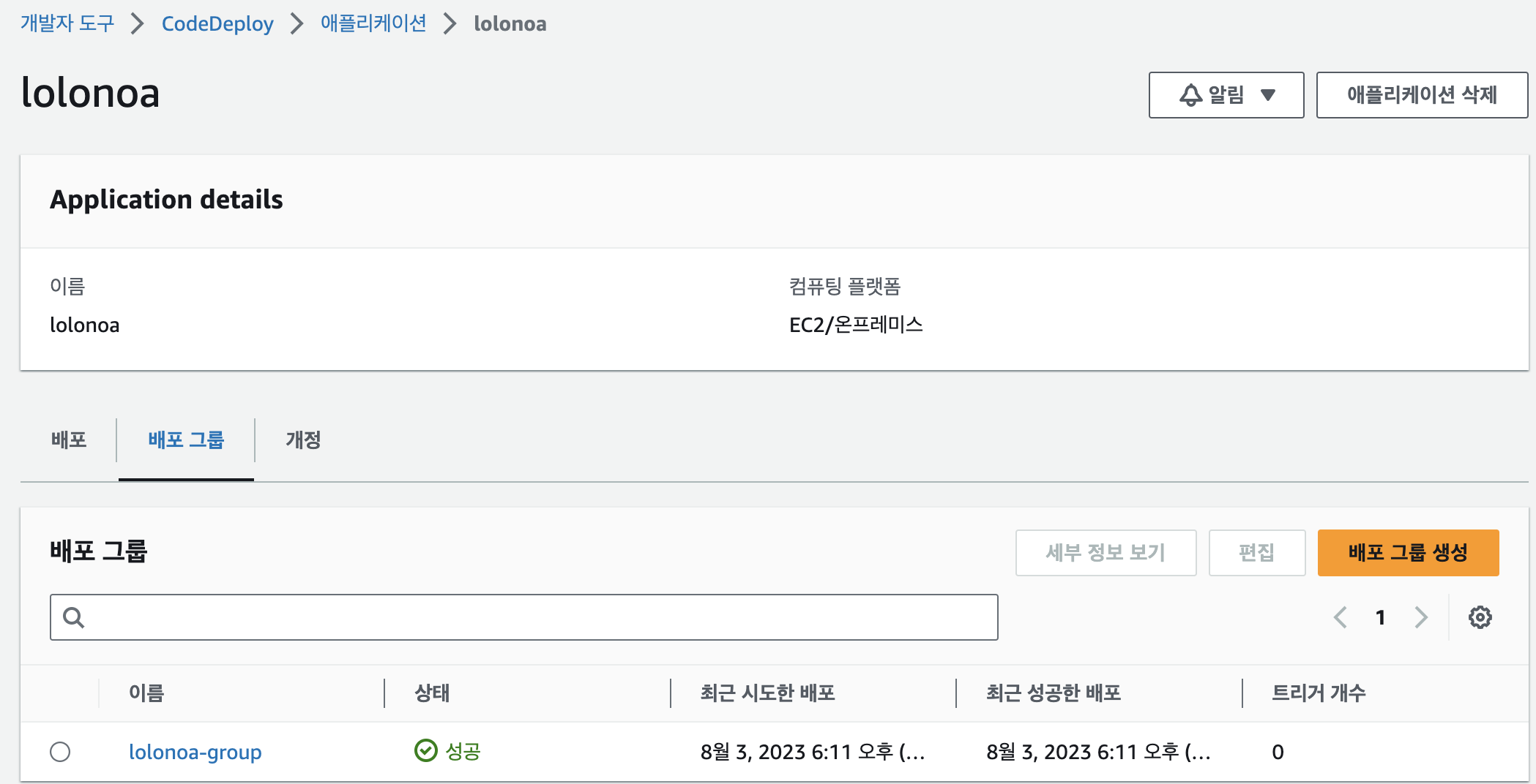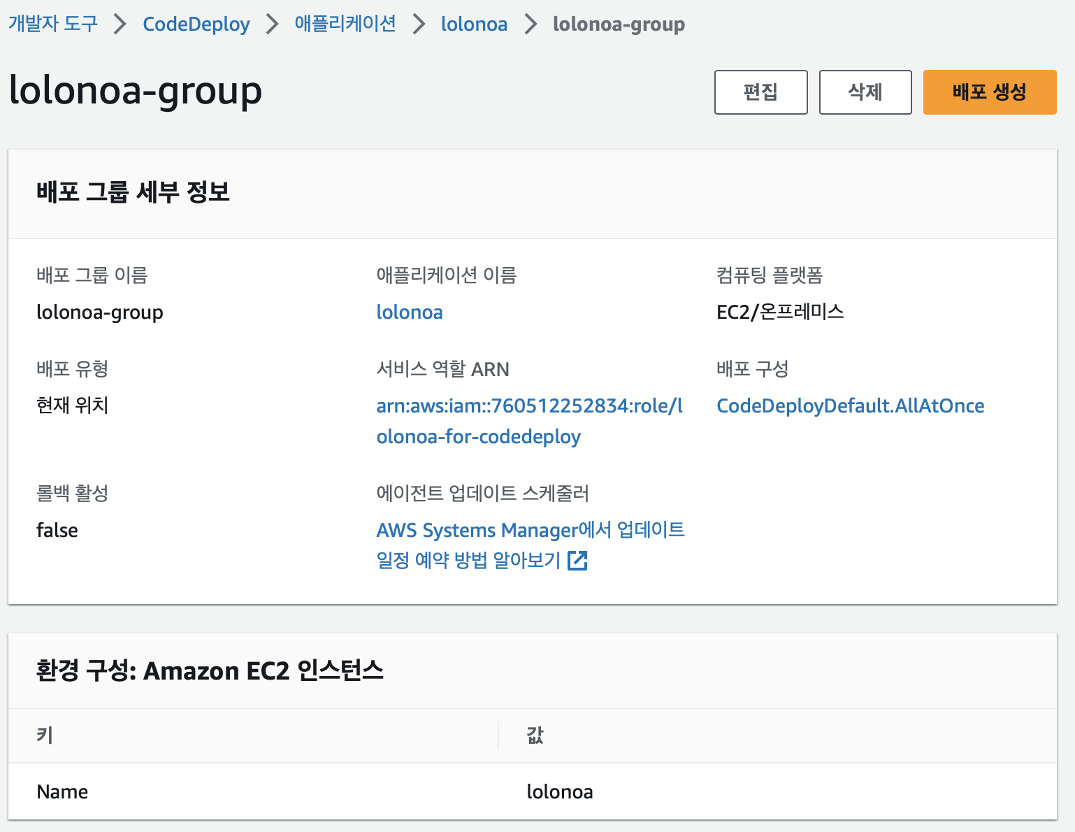 당시에는 이름을 lolonoa-codedeploy로 만들었는데, 이후에 lolonoa로 변경함