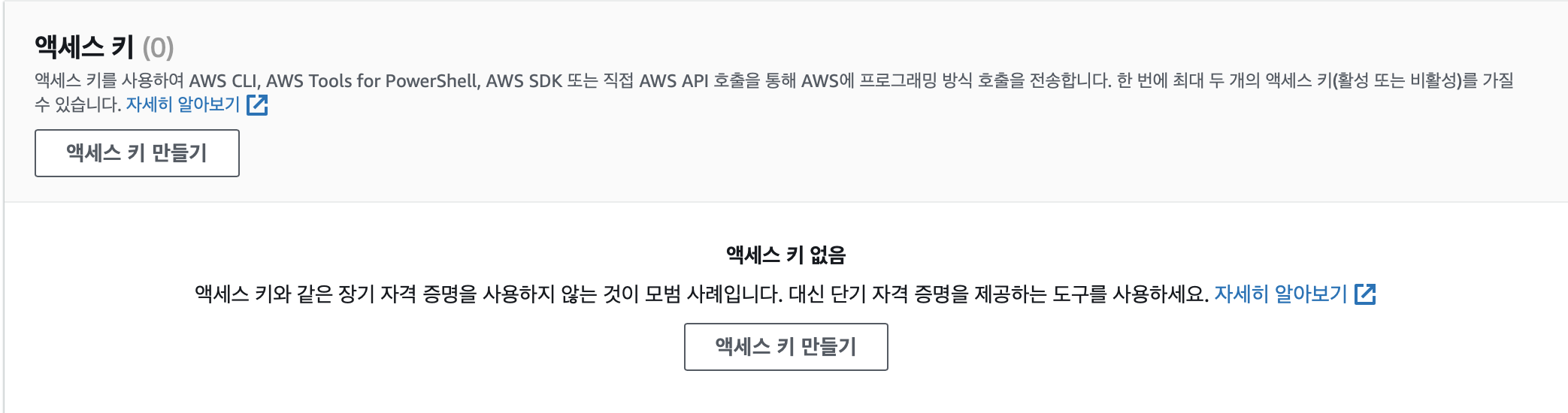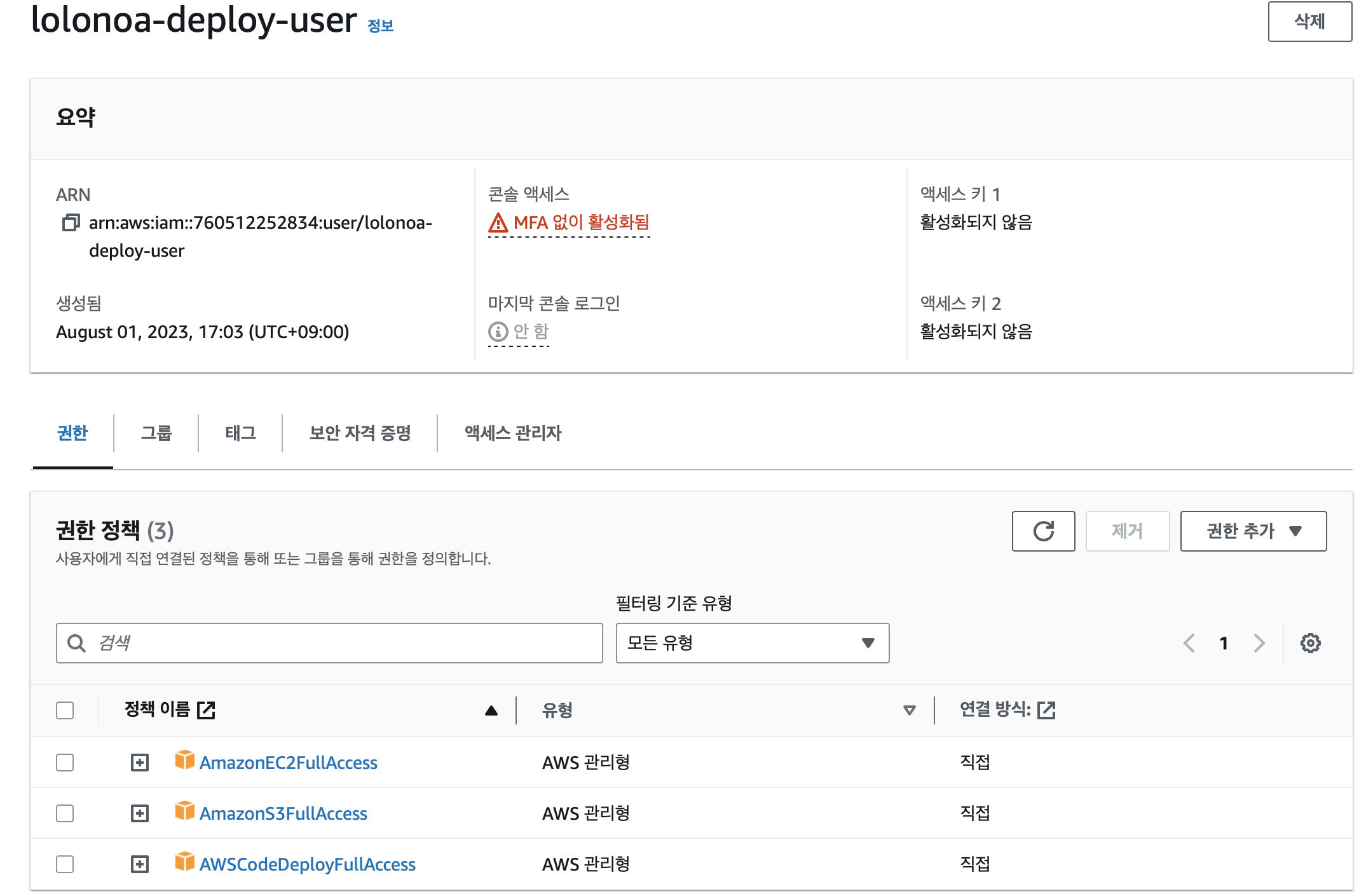 [사용자의 액세스 키 생성] → git action 내 프로젝트 키로 사용 됨